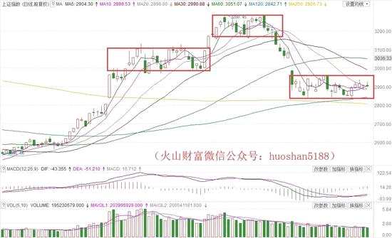 由于這3個震蕩平臺之間的距離非常近,所以從離我們最近的這個震蕩平臺(大約是2850~2950點之間)來看,只要向上突破3000點,就回到之前第1個震蕩平臺之中,有望震蕩向上;如果向下跌破這個平臺,又極有可能走完從3288點以來的向下走勢,從而再度發(fā)起上攻。整體來講,火山君是傾向于年內(nèi)寬幅震蕩上行這種走法。