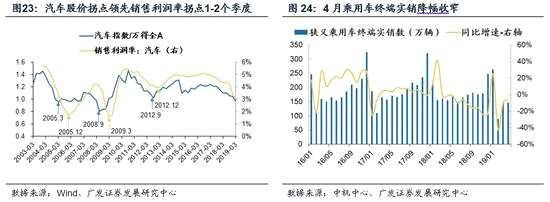 汽車股價相對收益的拐點(diǎn)略領(lǐng)先于銷售利潤率的拐點(diǎn)約1-2個季度。隨著汽車行業(yè)將加速庫存去化,銷量對收入的傳導(dǎo)將滯后對銷售利潤率產(chǎn)生拉動作用。各地促進(jìn)汽車消費(fèi)的政策密集推進(jìn),5月23日財政部、國家稅務(wù)總局發(fā)布車輛購置稅具體政策,5月28日廣東出臺消費(fèi)新政放寬廣州、深圳市汽車搖號和競拍指標(biāo)。隨著國六提前實(shí)施日期漸進(jìn),各車企陸續(xù)推出優(yōu)惠措施加速庫存去化,疊加減稅拉動效應(yīng),對乘用車終端銷量的增加起到提振作用。5-6月車市銷售有望進(jìn)一步回暖,銷量對收入的傳導(dǎo)將滯后對銷售利潤率產(chǎn)生拉動作用。