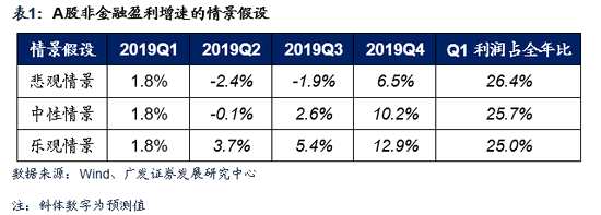 19年在不同的情景假設(shè)下A股非金融盈利增速年內(nèi)不排除有二度回踩,但在減稅降費(fèi)的托舉及去年底低基數(shù)效應(yīng)下,下半年盈利增速逐步進(jìn)入上行期仍較為確定。影響企業(yè)盈利的變量較多,但A股整體年內(nèi)的盈利節(jié)奏有一定的季節(jié)性規(guī)律,我們可以基于歷史上Q1單季利潤占比外推、與歷史單季環(huán)比季節(jié)性規(guī)律擬合19年的A股盈利預(yù)測趨勢。年內(nèi)的支撐項(xiàng)來自于4月1號開始實(shí)施的減稅、工業(yè)品價格企穩(wěn)、去庫存周期逐步進(jìn)入尾聲、以及18年年報顯著的低基數(shù)效應(yīng);而盈利的下行風(fēng)險來自于“寬信用+寬貨幣”政策的邊際減緩、以及后續(xù)房地產(chǎn)及出口對經(jīng)濟(jì)產(chǎn)生的下拉擾動。在多種情景假設(shè)下,不排除經(jīng)濟(jì)下行壓力上升使A股非金融中報業(yè)績增速再度拐頭向下甚至回到負(fù)增長,但無論悲觀還是樂觀預(yù)期,三四季度盈利增速在庫存周期及基數(shù)效應(yīng)下依然能夠呈現(xiàn)明顯的上行趨勢。