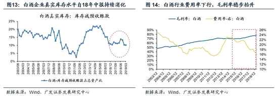 19年主流白酒廠商的提價行為已經(jīng)陸續(xù)發(fā)生,我們從毛利率和費(fèi)用率的剪刀差、以及白酒廠商的真實(shí)庫存水平來看提價行為對未來銷售利潤率的拉動。首先,白酒廠商的偏低庫存是19年提價的基礎(chǔ),用庫存減去預(yù)收賬款占比衡量的真實(shí)庫存水平自18年中報持續(xù)消化;其次,白酒行業(yè)的成本相對剛性,渠道改革使白酒行業(yè)的費(fèi)用率自15年持續(xù)下降,因此提價帶來的毛利率上升直接轉(zhuǎn)化為更大幅度的銷售利潤率改善。