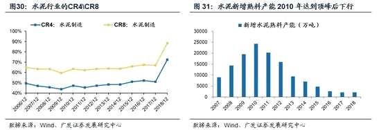 水泥行業(yè)近幾年的集中度快速向龍頭集中,直接帶來行業(yè)協(xié)同效應(yīng)凸顯、價格控制力增強(qiáng)、新增產(chǎn)能有限,推高行業(yè)的毛利率與資產(chǎn)周轉(zhuǎn)率。供給側(cè)改革加速了水泥行業(yè)落后企業(yè)的推出、份額向龍頭快速集中,17-18年,水泥行業(yè)的CR4與CR8分別從51.0 %/67.2%提升至72.4%/88.4%。