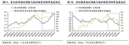 由于銷售利潤率衡量了需求、定價、成本、費(fèi)用等一攬子經(jīng)營決策的有效性,因此在行業(yè)指數(shù)表現(xiàn)上,部分消費(fèi)行業(yè)的銷售利潤率在中期與股價呈現(xiàn)出顯著的正相關(guān)性。消費(fèi)行業(yè)品牌價值的效應(yīng)使得銷售利潤率相比于產(chǎn)能周期及杠桿率更為敏銳的反應(yīng)股價的變化。