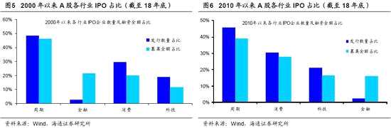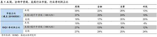 A股、美股中周期股市值占比為39%、19%,科技股市值占比為13%、29%。我們將A股與美股中的所有個股先按照Wind一級行業(yè)分類,再將11個一級行業(yè)劃分為周期(能源、材料、工業(yè)、公用事業(yè)、地產(chǎn))、消費(可選消費、日常消費、醫(yī)療保?。⒖萍迹ㄐ畔⒓夹g(shù)、電信服務(wù))、金融四個大類行業(yè)后,計算各大行業(yè)的市值和利潤占比。從市值占比角度看,A股周期金融股占比高,消費科技占比低。截止2019/05/30,周期股在A股中的市值占比為39%,金融為22%,消費26%,科技13%;而美股中周期占比19%、金融為17%、消費35%,科技29%。從利潤占比角度看,A股中金融業(yè)的利潤一家獨大,19Q1占比為62%,周期為19%,消費15%,科技4%;而美股的結(jié)構(gòu)更加均勻,金融、周期、消費、科技四個行業(yè)的利潤占比分別為24%、27%、25%、24%。A股市場結(jié)構(gòu)失衡源自過分倚重財務(wù)標(biāo)準(zhǔn)的發(fā)行制度?!渡鲜兄贫雀母飳⒏淖兪袌錾鷳B(tài)-20180313》中我們對比過A股與美股的上市制度,A股發(fā)行制度更強調(diào)財務(wù)指標(biāo),主板(含中小板)新股發(fā)行要求企業(yè)在上市前必須連續(xù)3年盈利,并且累計凈利潤需要超過3000萬,創(chuàng)業(yè)板新股發(fā)行要求企業(yè)在上市前兩年凈利潤累計不少于1000萬元,且持續(xù)增長,或最近1年盈利且凈利潤不少于500萬元,最近一年營業(yè)收入不少于5000萬元,最近兩年營業(yè)收入增長率均不低于30%,而美股則更加靈活,如紐交所規(guī)定企業(yè)只要資產(chǎn)規(guī)模較大、質(zhì)量高且有盈利潛力,即使短期沒有產(chǎn)生收入也可以上市。而在由需求擴張驅(qū)動的傳統(tǒng)盈利回升周期中,周期股往往業(yè)績靚麗,更易滿足A股新股發(fā)行制度的盈利要求,從而導(dǎo)致A股周期類上市公司數(shù)量和融資金額更多。2000-2018年,周期行業(yè)IPO企業(yè)數(shù)量占比達49%、金額占46%,而消費行業(yè)IPO企業(yè)數(shù)量占30%、金額占20%,科技19%、12%,金融3%、22%。即使是2010年以來,經(jīng)濟轉(zhuǎn)型過程加快,2010-2018年周期行業(yè)的上市數(shù)量和金額占比依舊較高,分別達46%、39%,而科技行業(yè)IPO數(shù)量和金額占比僅21%、17%。我國有許多科技企業(yè)因制度原因而到中國香港或遠赴美國上市,單獨計算這部分境外中資股的市值和利潤結(jié)構(gòu):市值角度截止2019/05/30境外中資股中科技和消費的市值占比為52%,高于A股的39%,其中科技占比高達30%,略高于美股;利潤角度境外中資股中金融利潤占比依舊很高,19Q1為51%,但低于A股的62%。