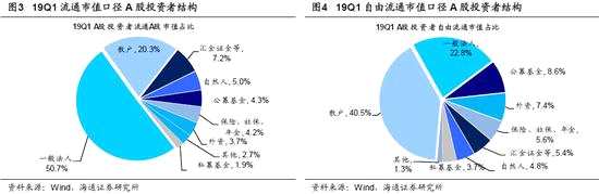 與美股相比A股機構(gòu)投資者少,持有市值占比只有13%。描述股市投資者結(jié)構(gòu)的數(shù)據(jù)來源有多種,且A股與美股存在的統(tǒng)計口徑上的差異,因此兩地的數(shù)據(jù)需要將口徑調(diào)整至一致才能進行比較。美股的投資者結(jié)構(gòu)數(shù)據(jù)有美聯(lián)儲與Bloomberg兩個來源,此外上交所在2013年發(fā)布的《大力推進機構(gòu)投資者參與上市公司治理》中也對美股的1970-2013年的投資者結(jié)構(gòu)進行過測算。由于Bloomberg對各類機構(gòu)的分類不常規(guī)且數(shù)據(jù)與上交所差異極大,本文采用更加官方、可信度更高的美聯(lián)儲數(shù)據(jù)。美聯(lián)儲在金融賬戶表(Financial Accounts of the United States)中統(tǒng)計了各類市場參與者的持股市值,根據(jù)最新的數(shù)據(jù),18Q4美股市值中Household Sector(散戶、自然人及非盈利型組織等)持股市值占比為37.6%,政府及其他占比為5%,機構(gòu)投資者為57.4%(較大的機構(gòu)投資者如共同基金及ETFs占比29%、外資15%、養(yǎng)老金等險資12%)。美聯(lián)儲統(tǒng)計的市值包括了公開和限售市值兩部分,類似A股總市值概念。A股的市值有三種口徑:第一是總市值口徑,即包括了限售股和流通股,19Q1散戶持股市值占比為16.9%,自然人和法人占比57.7%,機構(gòu)占比只有13.2%,與美聯(lián)儲的數(shù)據(jù)相比,散戶與法人等指標(biāo)由于口徑差異并不直接可比,但是機構(gòu)投資者占比是可比的,可見A股中機構(gòu)投資者相比美股占比明顯少。第二個口徑是流通市值,我們測算,19Q1散戶持股市值占比為20.3%,自然人和法人占比55.7%,機構(gòu)占比只有14.1%(公募4.3%、保險類資金4.2%、外資3.7%、私募1.9%)。第三個口徑是自由流通市值,即在流通市值的基礎(chǔ)上剔除了一些看起來流通但實際上持有者并不會真的拿出來交易的股票(如已經(jīng)解禁的控股股東持股等),我們測算該口徑下,19Q1散戶持股市值占比為40.5%,自然人和法人占比27.6%,機構(gòu)占比為25.2%(公募8.6%、外資7.4%、保險類資金5.6%、私募3.7%)。