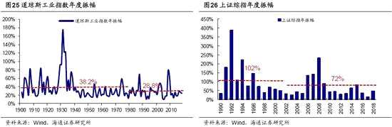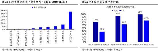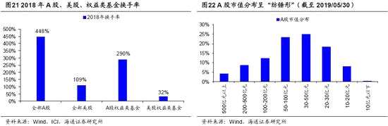 整體上看,A股波動大,市值分布呈“紡錘形”。我們從以下幾個角度來分析A股和美股在整體上的特征差異:第一,從市值特征上看,A股市值分布呈“紡錘形”,將A股所有個股按總市值從大到小排列,截至2019/05/30,市值位于200億元以上的股票數(shù)量占比為13%,市值位于20-200億元區(qū)間的股票數(shù)量占比為79%,市值位于20億元以下的股票數(shù)量占比為8%。作為對比,美股市值分布呈“金字塔形”,市值位于100億美元以上的股票數(shù)量占比為12%,市值位于10-100億美元區(qū)間的股票數(shù)量占比為32%,市值位于10億美元以下的股票數(shù)量占比為56%。第二,從市場成交特征來看,大市值公司往往集中了較大的成交金額,而A股市場的集中度還較低,2018年底A股市值排名前10%、30%、50%股票的全年成交額分別占A股年總成交額的37%、63%、77%,而美股為71%、92%、98%。第三,從被動資金占比來看,A股中配置資金的力量較弱,截止2018年我國跟蹤指數(shù)的基金(被動指數(shù)型+ETF)規(guī)模占權(quán)益類基金比重為34%,相當(dāng)于美股六年前的水平。第四,從換手率看,A股換手率較高,2018年全部A股的換手率為448%,遠高于美股109%的換手率,而其中權(quán)益類公募基金的年度換手率為290%,也遠高于美股權(quán)益類基金32%的換手率。第五,從指數(shù)的振幅來看,美股1980年代以前道瓊斯工業(yè)指數(shù)年度振幅(指數(shù)最大值/最小值-1)的平均值為38%,最大為174%,最小為13%。1980后,機構(gòu)投資者發(fā)展壯大使得美股波動減小,1980-2018年道指年度振幅平均值下降到29%,最大為78%,最小為10%。相比之下,A股的波動性還很大,上證綜指2005年以前年度振幅平均值為102%,最大為388%,最小為26%,2005以后波動性略有減小,2005-2018年振幅平均值為72%,最大為231%,最小為14%。