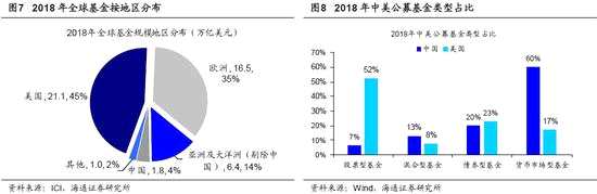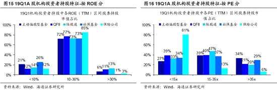 中國基金總規(guī)模不到美國的10%,股票型只有1%,持股分散、目前偏大消費。截止19Q1,公募基金持股市值占A股自由流通市值的比重為8.6%,是A股最大的機構(gòu)投資者,然而與美國相比,我國的公募基金還有很大的發(fā)展空間。根據(jù)The Investment Company Institute (ICI)的統(tǒng)計,18年底美國各類開放式基金總規(guī)模為21.1萬億美元,占全球開放式基金市場規(guī)模的45%,位列第一,而我國只有1.8萬億美元,全球占比4%,不到美國的10%。結(jié)構(gòu)上看,美國的開放式基金主要是共同基金(Mutual Fund),規(guī)模(占比)為17.7萬億美元(84%),其余是ETF基金。美國共同基金中占比最大的是股票型基金,規(guī)模為9.2萬億美元,占比高達52%,其次是占比23%的債券型基金、17%的貨幣基金以及8%的混合型基金。而我國公募基金以貨幣基金為主,占比60%,債基20%,混合型基金13%,股票型基金只有7%,從絕對規(guī)模上看股票型基金規(guī)模只有美國的1.4%,股票型和混合型基金只有美國的3.7%。從基金季報細看A股中主動偏股型(普通股票型+偏股混合型+靈活配置型)公募基金的投資特征:風(fēng)格上,我們以基金重倉股中滬深300成分股的持股市值占比來衡量基金的價值成長風(fēng)格,可以發(fā)現(xiàn),2010年以來主動偏股型基金重倉股中滬深300成分股市值占比平均為58%,最低為15Q4的31%,最高為12Q4的79%,風(fēng)格偏好并不穩(wěn)定。16年以來價值風(fēng)格占優(yōu),19Q1滬深300成分股市值占比為64%;行業(yè)上,19Q1主動偏股型基金重倉股中行業(yè)市值占比前三的為食品飲料(15%)、醫(yī)藥(11%)和非銀金融(11%),且持股集中度較低,前三大行業(yè)持股市值占比為37%,低于險資的75%、社保的42%、QFII的53%、陸股通北上資金的41%;持股特征上,主動偏股型基金偏好低估值高盈利的個股,19Q1重倉股中PE(TTM)在35倍以下/以上的個股持股市值占比為66%/34%,ROE(TTM)在10%以下/10-30%/30%以上的個股占比分別為21%/72%/6%。
