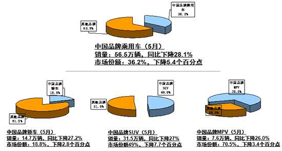 值得注意的是,自主品牌乘用車銷量和市場份額較上個月均出現(xiàn)一定的下滑。5月自主品牌銷量為56.5萬輛,同比下降28.1%,市場份額下降至36.2%,同比下降5.4個百分點,環(huán)比下降5.3個百分點;1-5月,自主品牌乘用車共銷售333.5萬輛,同比下降23.4%,市場份額僅為39.7%。