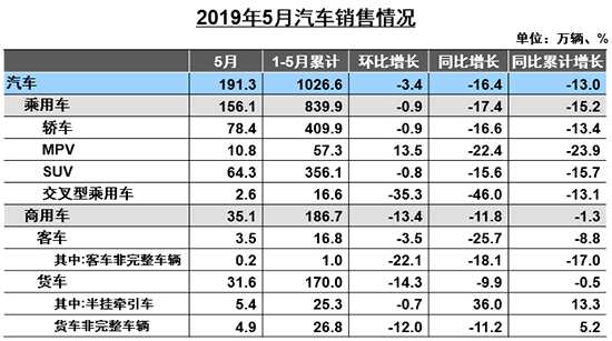 5月,汽車產(chǎn)銷量分別完成184.8萬輛和191.3萬輛,同比分別下降21.2%和16.4%,降幅有所擴大。許海東表示,汽車產(chǎn)銷下滑勢態(tài)加重主要是中低端車型消費群體購買能力下降。此外,國六切換的過程中對廠家、經(jīng)銷商,以及消費者都帶來一定的影響,而國家鼓勵政策姍姍來遲導致部分消費者選擇持幣待購。