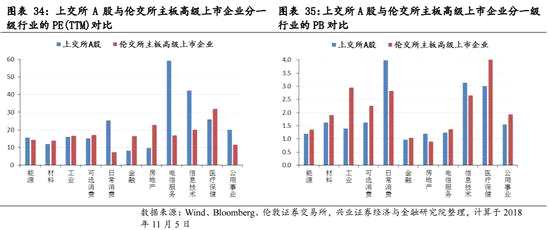 兩地企業(yè)不同行業(yè)的估值水平比較:上交所金融地產等估值較低,倫交所信息技術等估值較低