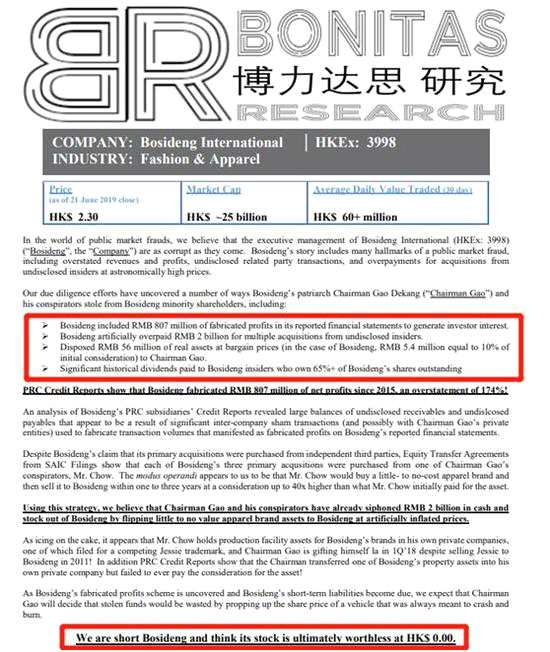 6月24日上午10點(diǎn),沽空機(jī)構(gòu)BONITAS發(fā)表沽空?qǐng)?bào)告,指控波司登在公開市場(chǎng)造假,夸大收入及盈利等,報(bào)告指,該股完全沒有價(jià)值,給予零元。