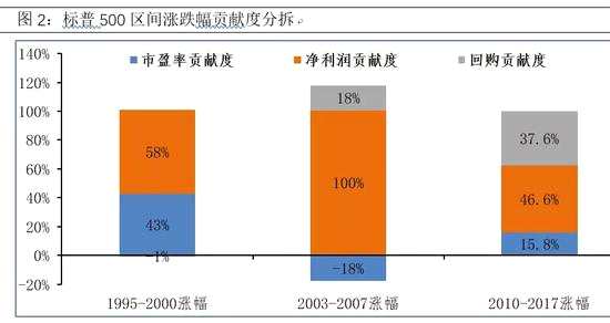 數(shù)據(jù)顯示,2010-2017年標普500上漲139.8%。按照貢獻比例拆解,回購貢獻了其中的37.6%,僅次于凈利潤貢獻度的46.6%。