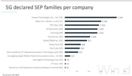 德國專利數(shù)據(jù)公司IPIytics發(fā)布的最新5G專利排行榜顯示,華為共獲得了2160個(gè)相關(guān)專利,排名第一。(參見下圖)