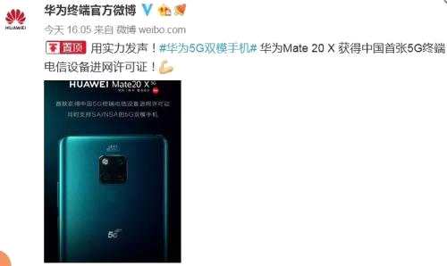 6月25日下午,華為披露,華為Mate20X獲得中國首張5G終端電信設(shè)備進(jìn)網(wǎng)許可證,編號001,支持SA、NSA雙模5G網(wǎng)絡(luò),雙卡雙待。