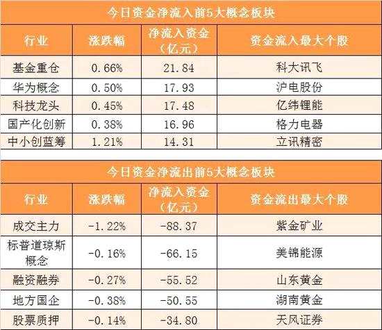概念板塊方面,今日基金重倉、華為概念、科技龍頭、國產(chǎn)化創(chuàng)新等概念板塊資金呈現(xiàn)凈流入,其中基金重倉概念凈流入21.84億元居首。