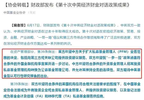 近期,監(jiān)管發(fā)布多條對(duì)外開放政策,比如證監(jiān)會(huì)發(fā)布的9項(xiàng)措施,還包括推動(dòng)修訂QFII/RQFII制度規(guī)則、允許合資證券和基金管理公司的境外股東實(shí)現(xiàn)“一參一控”等。還有,財(cái)政部發(fā)布《第十次中英經(jīng)濟(jì)財(cái)金對(duì)話政策成果》,在資產(chǎn)管理部分,第36條指出:英方歡迎中方關(guān)于擴(kuò)大私募基金管理人(PFM)業(yè)務(wù)范圍的決定,包括向第三方或關(guān)聯(lián)公司提供投資建議服務(wù)。雙方歡迎就“一參一控”政策涵蓋符合條件的外國金融機(jī)構(gòu)事宜展開進(jìn)一步討論。中方歡迎符合條件的外資基金管理人將其獨(dú)資私募基金管理機(jī)構(gòu)轉(zhuǎn)換為公募基金管理公司,并允許其保持業(yè)務(wù)的連續(xù)性。