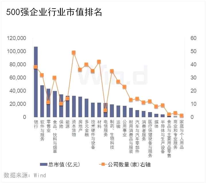 銀行業(yè)總市值最高,超過(guò)10萬(wàn)億元,軟件與服務(wù)行業(yè)緊隨其后;資本貨物行業(yè)入圍公司數(shù)量最多,達(dá)49家。
