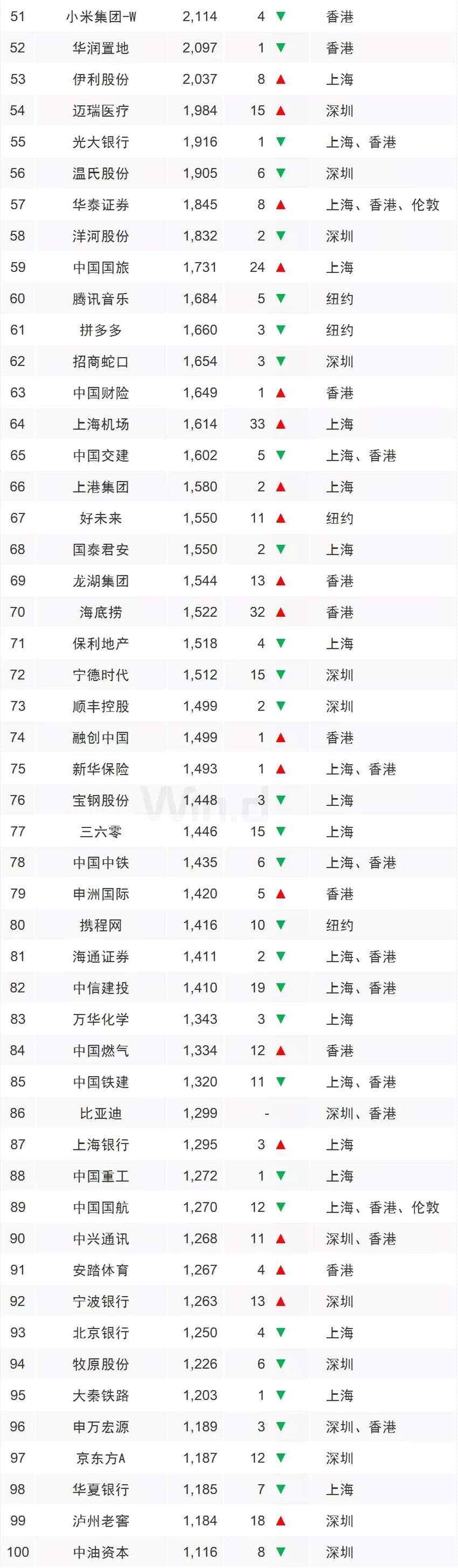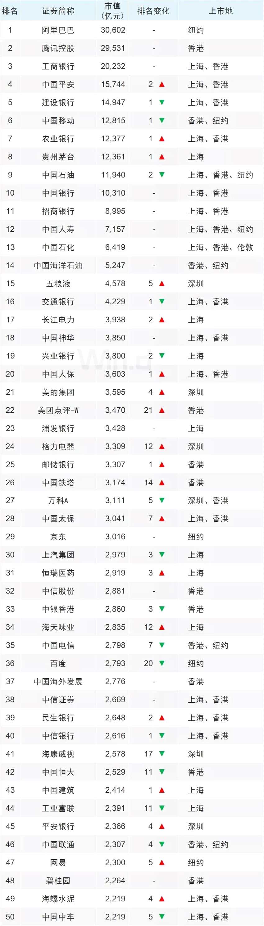 相比2019年一季度末,前10名排名表現(xiàn)穩(wěn)定,阿里巴巴、騰訊控股市值你追我趕,中國(guó)平安上升2位,建設(shè)銀行、中國(guó)移動(dòng)分別下滑1位,貴州茅臺(tái)上升1位,超過(guò)【中國(guó)石油(601857)、股吧】。整體來(lái)看,排名越靠后,名次波動(dòng)也越大。