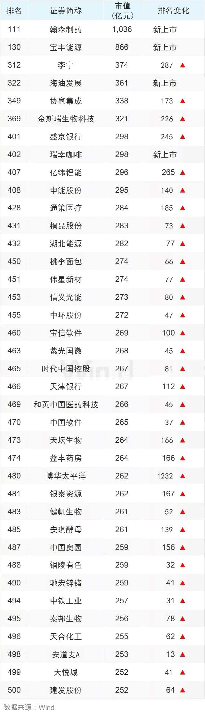 新進(jìn)500強(qiáng)企業(yè)中,多數(shù)因股價(jià)上漲市值攀升,亦有部分新上市企業(yè)。