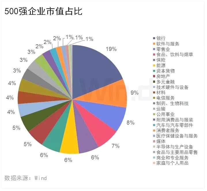 銀行業(yè)市值占比最高,達(dá)19%;其次是軟件與服務(wù)、零售業(yè),占比分別為9%和8%。
