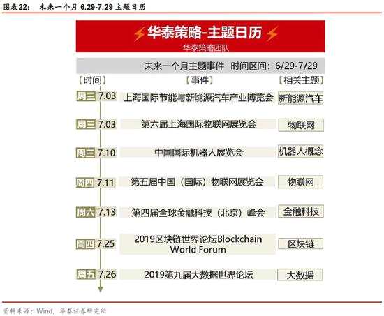 5-6月上證綜指在2800到3000點(diǎn)之間持續(xù)震蕩,上有頂主要受制于國(guó)內(nèi)經(jīng)濟(jì)和信用釋放,下有底主要有“政策底”的支撐。近期需要關(guān)注的重要事件:7月15日之前創(chuàng)業(yè)板中報(bào)預(yù)告披露完畢,短期市場(chǎng)對(duì)小盤業(yè)績(jī)的關(guān)注度增加,創(chuàng)業(yè)板內(nèi)部分化或?qū)⒓觿?,截?月29日按照中報(bào)業(yè)績(jī)預(yù)告上下限的平均數(shù)來(lái)看,中報(bào)預(yù)披露的公司中中報(bào)業(yè)績(jī)?cè)鏊佥^一季報(bào)提升的公司占56%,其中電子行業(yè)出現(xiàn)次數(shù)較多;7月百度AI開(kāi)發(fā)者大會(huì)(7月3日)、中國(guó)互聯(lián)網(wǎng)大會(huì)(7月9日)、世界電子競(jìng)技大賽(7月18日)陸續(xù)召開(kāi),可以積極關(guān)注最新科技進(jìn)展。