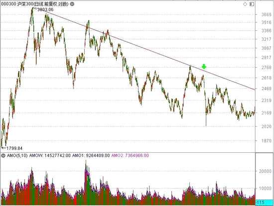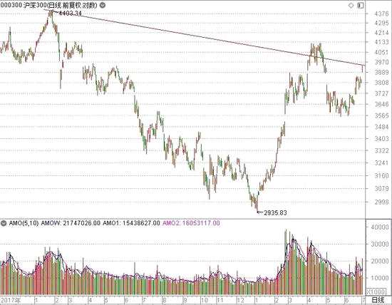 從6月10日以來(lái),滬深300指數(shù)展開(kāi)了小幅反彈,目前其剛好位于2015年牛市頂部以來(lái)的壓力線。在今年4月份,滬深300指數(shù)遇到此壓力線而回落,這表明這條壓力線是有效的。
