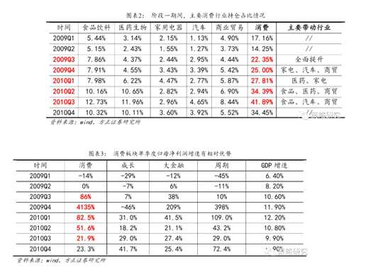 從2009Q2開始,隨著經(jīng)濟(jì)回升改善,各大類行業(yè)景氣度提升,但相對其他板塊,消費(fèi)領(lǐng)域的復(fù)蘇表現(xiàn)得一騎絕塵,2009Q3單季度消費(fèi)行業(yè)增速就從Q2的0%猛然提升至86%,Q4季度更是再次猛增了41倍,無論是增速的絕對水平還是提升幅度都遠(yuǎn)遠(yuǎn)超出了其他板塊。