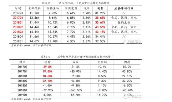 在2018年市場普遍下跌的過程中,機(jī)構(gòu)選擇抱團(tuán)消費(fèi)最重要的原因在于,期間消費(fèi)板塊業(yè)績增速仍具有相對的優(yōu)勢。從第三時期開始2017Q3—2018Q2期間,消費(fèi)板塊的業(yè)績增速始終位居第二,相對優(yōu)勢得以長期保持。從細(xì)分行業(yè)看,本時期消費(fèi)抱團(tuán)主要集中在食品飲料、醫(yī)藥生物和家用電器行業(yè)。