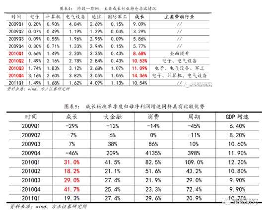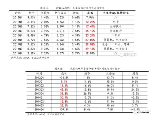 直到2010年成長類產(chǎn)業(yè)振興規(guī)劃效果顯現(xiàn),此外疊加蘋果第四代手機(jī)問世帶來的智能手機(jī)時代,電子消費(fèi)品需求飛速增長,成長類行業(yè)爆發(fā)出了耀眼的增長方式,其持倉占比情況才出現(xiàn)了明顯好轉(zhuǎn)。進(jìn)入2010年,此時四萬億等刺激計劃效果出現(xiàn)減弱,經(jīng)濟(jì)增速開始逐漸回歸,消費(fèi)、金融、周期等類別行業(yè)業(yè)績增速也在逐步放緩的背景下,然而成長行業(yè)卻呈現(xiàn)出業(yè)績逆勢快速增長的獨(dú)特靚麗風(fēng)景線。2010Q1其他大類行業(yè)盡管仍然維持著高速增長水平,但實質(zhì)上增速的絕對水平是在下滑的,僅只有成長板塊業(yè)績景氣度在提升。在這種情況下,2010Q3季度,成長板塊一躍成為業(yè)績增速最快的板塊,業(yè)績上已具備相對優(yōu)勢,2010Q4季度這種優(yōu)勢仍然得以保持。