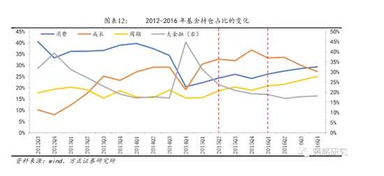 在2011Q3—2014Q2期間,市場先后抱團(tuán)了消費(fèi)、大金融和成長。具體的,2011Q4開始市場重新抱回消費(fèi)板塊,此后直到2014Q2時,消費(fèi)板塊的持倉占比都基本都穩(wěn)定在37%左右。大金融板塊也出現(xiàn)過短暫抱團(tuán),直到2012Q4時,大金融板塊持倉占比提升至了近40%。從2013年初,成長板塊也醞釀了一次大的抱團(tuán)機(jī)會,這次成長抱團(tuán)從2013年初持續(xù)到了2016Q2,持倉占比從不到8%,提升至了33%。