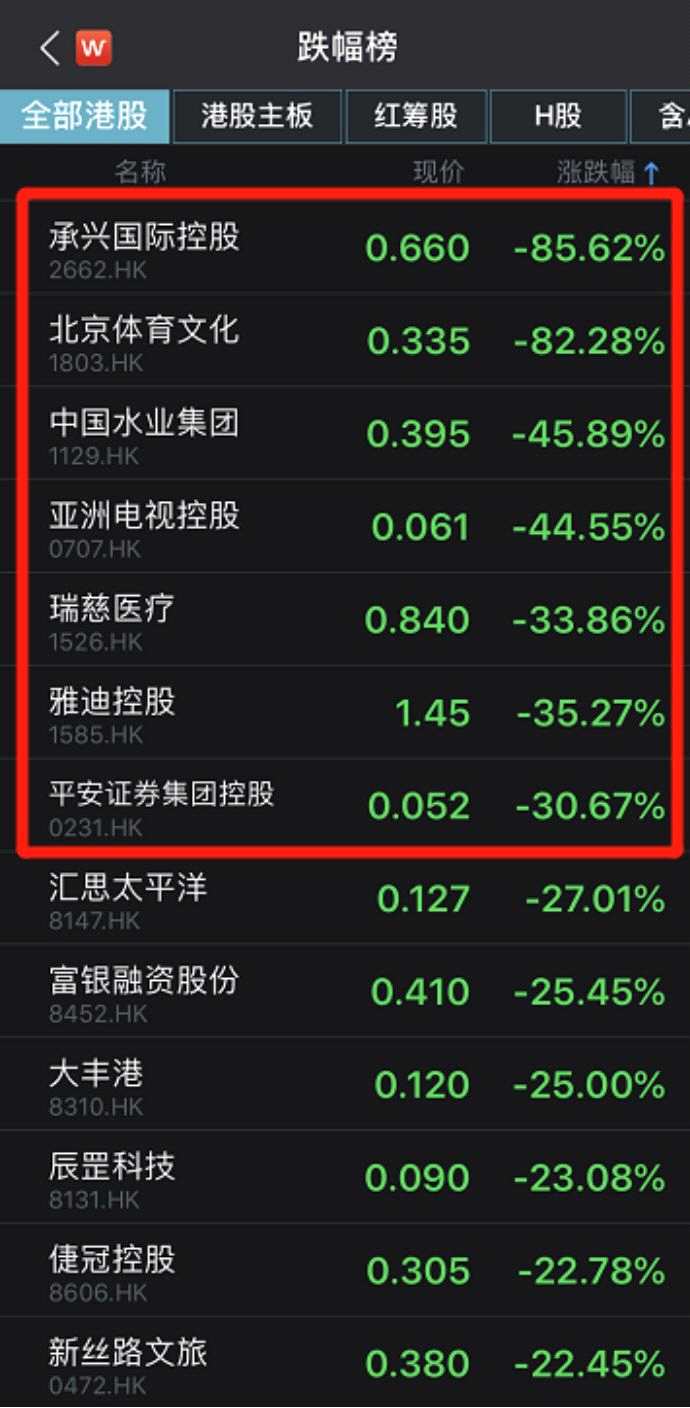 而港股那邊,更是跌得驚心動魄。截至記者發(fā)稿,恒生指數(shù)跌幅達(dá)1.63%,其中多只股票閃崩,承興國際控股、北京體育文化跌幅超80%。