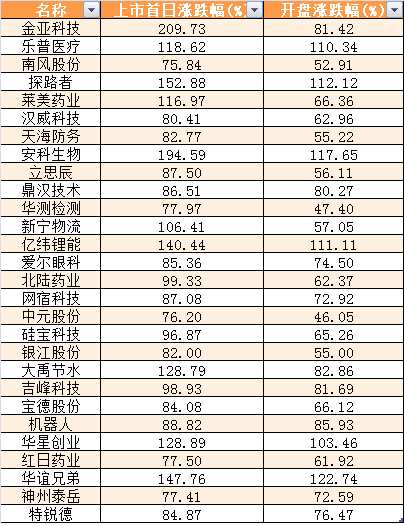 另外,距離7月22日科創(chuàng)板首批25家公司上市時(shí)間越來越近,回顧2009年創(chuàng)業(yè)板開板首日,28只新股全線普漲,開盤平均漲76%,收盤平均漲106%,金亞科技(維權(quán))以209.73%的漲幅位居榜首,安科生物、探路者首日漲幅超過150%,當(dāng)日兩市上漲家數(shù)1325家,平盤家數(shù)111家,下跌家數(shù)304家,上漲比例高達(dá)76%。
