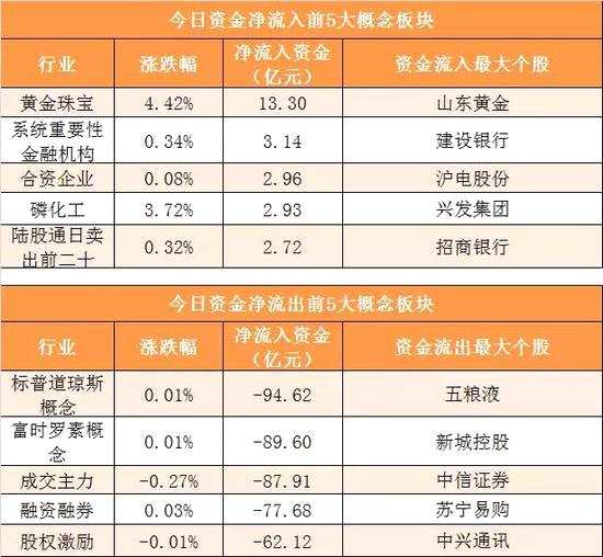 概念板塊方面,今日黃金珠寶、系統(tǒng)重要性金融機(jī)構(gòu)、合資企業(yè)、磷化工等概念板塊資金呈現(xiàn)凈流入,其中黃金珠寶概念凈流入13.3億元居首。