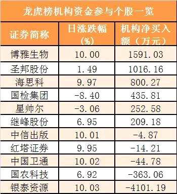 盤后龍虎榜數(shù)據(jù)顯示,機(jī)構(gòu)現(xiàn)身11股,其中【博雅生物(300294)、股吧】等6股呈現(xiàn)機(jī)構(gòu)資金凈買入,銀泰資源等5股呈現(xiàn)機(jī)構(gòu)資金凈賣出。