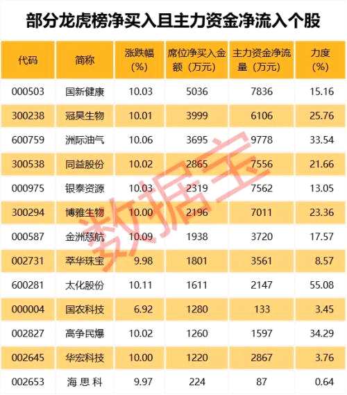 從盤口資金流向來看,主力資金凈流入超千萬且龍虎榜凈買入個(gè)股共有11只,其中洲際油氣、國(guó)新健康、銀泰資源(行情000975,診股)等個(gè)股資金凈流入金額最大。凈流入力度最大的個(gè)股有太化股份(維權(quán))(行情600281,診股)、高爭(zhēng)民爆(行情002827,診股)、洲際油氣,凈流入力度分別為55.08%、34.29%、33.54%。