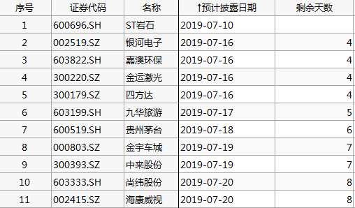 中報業(yè)績預(yù)告浪襲來,數(shù)據(jù)顯示,本周公布業(yè)績預(yù)告的公司的家數(shù)分別為20家,49家,64家,97家和109家,呈逐漸上升趨勢,除了搶頭籌的ST巖石(維權(quán))已披露中報外,下周將有【銀河電子(002519)、股吧】、四方達、嘉澳環(huán)保、金運激光、九華旅游、貴州茅臺、中來股份、金宇車城、??低暋⑸芯暪煞?0家公司公布中報。