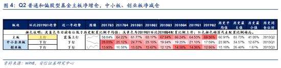 目前,中小創(chuàng)業(yè)板配置水平均低于歷史平均。Q2國(guó)內(nèi)普通和偏股型基金加倉(cāng)主板,創(chuàng)業(yè)板和中小板減持。具體而言,2019Q2主板配置凈增倉(cāng)5.02pct,中小板凈減倉(cāng)3.52pct,創(chuàng)業(yè)板凈減倉(cāng)1.51pct。其中,主板配置仍高于歷史平均水平,中小板和創(chuàng)業(yè)板配置比例依然偏低。