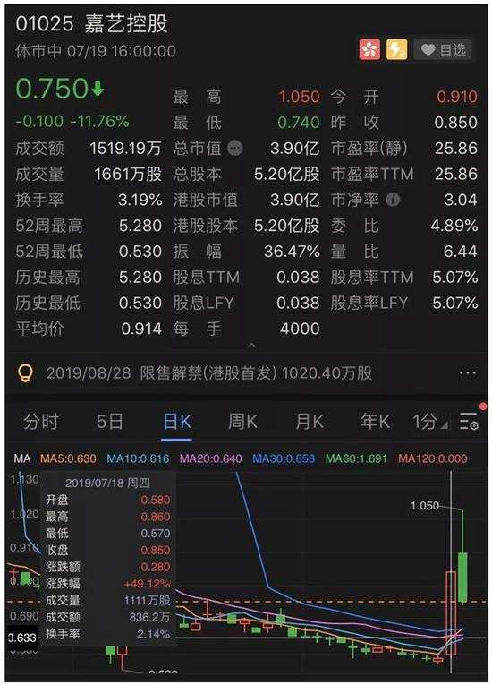 在5月15日突然暴跌75%的嘉藝控股則在18日上漲了49.12%,但19日又大跌了11.76%。這只市值只有數(shù)億港元的低價股,在閃崩之后的5月底,曾收到過港交所的摘牌預警函。