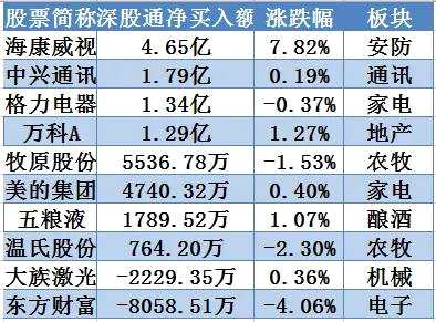 深股通凈買入個(gè)股達(dá)到8只,其中4只個(gè)股凈買入額超過(guò)億元,【海康威視(002415)、股吧】?jī)糍I入額4.65億元居首,沒(méi)有個(gè)股凈賣出額超過(guò)億元。