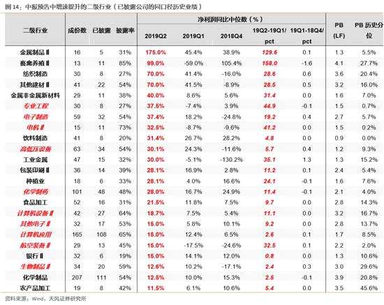 首先,按條件:①披露數(shù)>5、②19Q2增速中位數(shù)大于10%且環(huán)比提升、③PB歷史分位數(shù)<50%,篩選出以下的行業(yè)。我們看到,除了食品飲料、農(nóng)業(yè)等景氣持續(xù)高企的行業(yè)外,有不少TMT和高端制造領(lǐng)域業(yè)績(jī)也出現(xiàn)轉(zhuǎn)好的趨勢(shì)。在本文第三部分,我們將聯(lián)合天風(fēng)研究所相關(guān)行業(yè),對(duì)具體的細(xì)分領(lǐng)域及個(gè)股做進(jìn)一步分析。