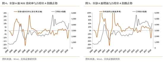 (1)指數(shù)的市場(chǎng)走勢(shì)與指數(shù)的盈利趨勢(shì)(凈利潤(rùn)增速、ROE變化率)較為一致,體現(xiàn)在拐點(diǎn)的變化上往往具有同步性。這里要說(shuō)明的是,ROETTM的環(huán)比變化率與凈利潤(rùn)增速在概念上反應(yīng)的都是盈利的一階變化,但市場(chǎng)有時(shí)候反應(yīng)更加左側(cè),這時(shí)也可進(jìn)一步參考二階變化(如凈利潤(rùn)增速的變化率)。為了便于理解,以下的圖表中,左邊放ROE變化率圖表,右邊放凈利潤(rùn)增速圖表。注:圖表中,ROE和TTM值,變化率=當(dāng)期/上期-1。