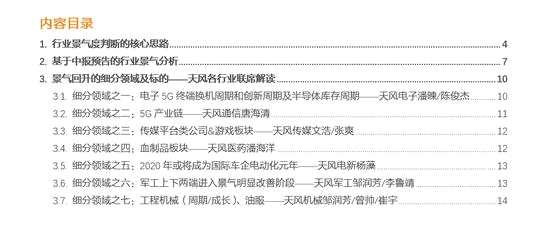 在第二部分,我們通過(guò)盈利趨勢(shì)及估值水平的分析,認(rèn)為除了食品飲料、農(nóng)業(yè)等景氣持續(xù)高企的行業(yè)外,有不少TMT和高端制造領(lǐng)域業(yè)績(jī)也出現(xiàn)轉(zhuǎn)好的趨勢(shì)。在此,我們聯(lián)合了天風(fēng)各行業(yè)對(duì)景氣可能回升的細(xì)分領(lǐng)域及可關(guān)注標(biāo)的做進(jìn)一步解讀。