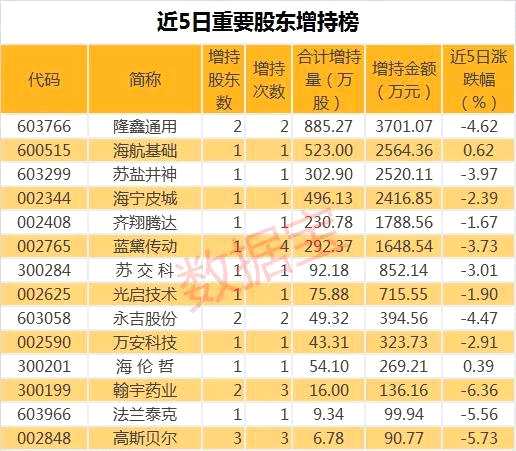 14股近5日獲重要股東增持,其中,6股增持金額超千萬元,【隆鑫通用(603766)、股吧】增持金額居首。