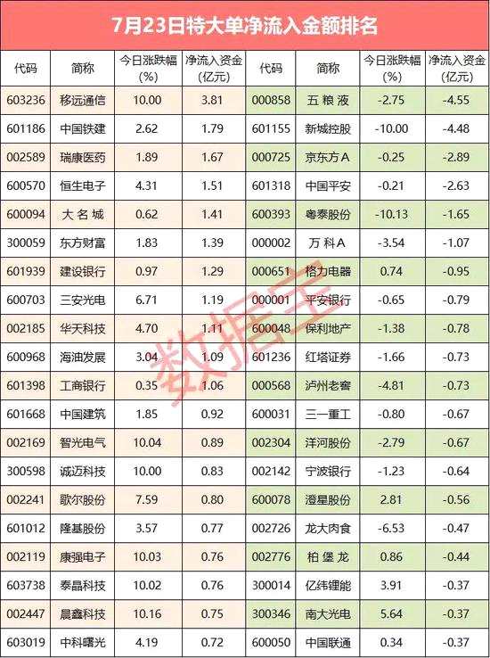 兩市全天特大單凈流入3.82億元,【移遠(yuǎn)通信(603236)、股吧】特大單凈流入3.81億元,特大單凈流入資金居首。