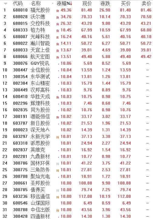 今日,【福光股份(688010)、股吧】大漲49.36%,沃爾德大漲34.76%,25只科創(chuàng)板個股中已有兩只創(chuàng)出上市以來的新高。從兩市40多只漲停股來看,大部分也是科技股。