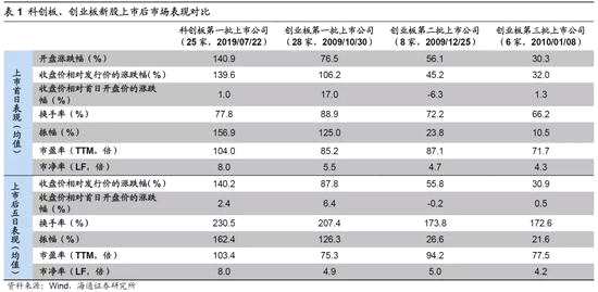 以包容的心態(tài)看科創(chuàng)板的初期表現(xiàn)。最近一周市場最大的焦點(diǎn)是科創(chuàng)板正式開市。我們對科創(chuàng)板第一批25家上市公司的具體表現(xiàn)情況進(jìn)行回顧,首日科創(chuàng)板個股相對發(fā)行價和開盤價平均漲幅分別為139.6%、1.0%,首周科創(chuàng)板個股相對發(fā)行價和開盤價平均漲幅分別為140.2%、2.4%。首周總成交額約1429億元,占同期全部A股成交額的7.6%?;仡檮?chuàng)業(yè)板第一批28家上市公司表現(xiàn)情況,首日創(chuàng)業(yè)板個股相對發(fā)行價和開盤價平均漲幅分別為106.2%、17.0%,首周分別為87.8%、6.4%,首周總成交額約440億元,占同期全部A股成交額的3.4%。作為金融供給側(cè)結(jié)構(gòu)性改革的重要舉措,科創(chuàng)板獲得了市場的廣泛關(guān)注與積極參與,由于設(shè)定了上市后5個交易日內(nèi)不設(shè)漲跌幅限制的機(jī)制,科創(chuàng)板首批上市公司較創(chuàng)業(yè)板在首日和首周相對發(fā)行價的平均漲幅要更高,成交占比也更高。同時我們將科創(chuàng)板、創(chuàng)業(yè)板首批上市公司相對發(fā)行價和開盤價的漲跌幅進(jìn)行對比,發(fā)現(xiàn)股價漲幅主要集中在發(fā)行價到開盤價這一區(qū)間。從發(fā)行PE來看,科創(chuàng)板的第一批上市公司的平均發(fā)行PE為104.0倍(TTM,后同),相比于創(chuàng)業(yè)板當(dāng)前平均61.5倍的PE存在69.1%的溢價;創(chuàng)業(yè)板的第一批上市公司的平均發(fā)行PE為85.2倍,相比于中小板當(dāng)時平均61.6倍的PE存在38.3%的溢價。觀察創(chuàng)業(yè)板開市初期市場表現(xiàn)情況,首批上市公司的日成交額和日換手率隨時間推移逐漸回落,日成交額中樞從首月(剔除第一天,后同)的39億元下降到第三月的14億元,日換手率中樞從首月的18%下降到第三月的6%。將創(chuàng)業(yè)板首批上市公司市場表現(xiàn)同第二批、第三批進(jìn)行縱向?qū)Ρ龋ㄔ斍橐姳?),創(chuàng)業(yè)板第二批上市公司首日漲幅、換手率及振幅分別為45.2%、72.2%和23.8%,首周分別為55.8%、173.8%和26.6%;創(chuàng)業(yè)板第三批上市公司首日漲幅、換手率及振幅分別為32.0%、66.2%和10.5%,首周分別為30.9%、172.6%和21.6%??傮w來看上市公司上市批次越晚,漲幅、換手率及振幅這三項(xiàng)指標(biāo)相比批次早的波動更小。我們認(rèn)為未來科創(chuàng)板一段時間內(nèi)的表現(xiàn)可能和創(chuàng)業(yè)板初期相似,隨著市場關(guān)注度的下降,市場逐漸趨于理性平穩(wěn)。作為資本市場的重要組成部分,科創(chuàng)板的推出不是創(chuàng)業(yè)板的簡單替代,而是一種有效補(bǔ)充。如同其他新生事物,科創(chuàng)板和注冊制的推行也將經(jīng)歷磨合、成長的過程方能邁向成熟,在運(yùn)行初期出現(xiàn)波動和調(diào)整都是正常的,我們應(yīng)當(dāng)以更加包容的心態(tài)看科創(chuàng)板的初期表現(xiàn)。