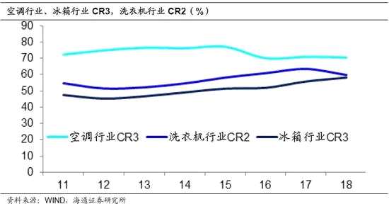 在冰箱行業(yè),海爾、美的和海信科龍份額排名前三,其合計(jì)內(nèi)銷市場份額在12年為45.3%,而在18年升至58.2%,其中排第一的海爾18年份額達(dá)到33.1%。