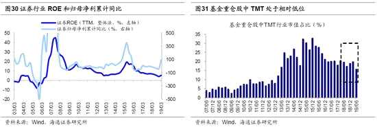 從業(yè)績(jī)看:牛市主導(dǎo)產(chǎn)業(yè)盈利回升陡峭,“科技+券商”基本面有望觸底回升。我們第二部分研究發(fā)現(xiàn)牛市第二階段主導(dǎo)產(chǎn)業(yè)上漲往往是盈利估值戴維斯雙擊的過(guò)程,這其中基本面向好是重要支撐,往后看我們認(rèn)為科技+券商基本面有望觸底回升。對(duì)科技股來(lái)說(shuō),政策面產(chǎn)業(yè)政策向科技傾斜,科創(chuàng)板、融資放開(kāi)等舉措將帶動(dòng)VC/PE為科技企業(yè)注入增量資金,同時(shí)伴隨著5G等新技術(shù)的推廣應(yīng)用,將帶動(dòng)行業(yè)需求回暖以及產(chǎn)生新需求、增加訂單,推動(dòng)ROE改善?;久婵纯萍脊勺钚乱惠営厣谑加?2Q4,高點(diǎn)在16Q1,此后開(kāi)始回落,至19Q1已持續(xù)26個(gè)季度。隨著三年業(yè)績(jī)承諾到期,大量商譽(yù)減值損失直接沖抵凈利潤(rùn),18Q4科技股歸母凈利累計(jì)同比低至-36.9%,至此前期并購(gòu)重組對(duì)科技股業(yè)績(jī)的拖累基本告一段落。目前科技股盈利處在周期性底部,19Q1通信ROE(TTM)為2.9%,電子為7.3%,計(jì)算機(jī)為3.5%,均低于A股的9.3%,ROE(TTM)均處在歷史偏低位置。未來(lái)隨著資本市場(chǎng)改革及創(chuàng)新戰(zhàn)略的推進(jìn),科技股盈利有望進(jìn)入新一輪回升周期。對(duì)券商股來(lái)說(shuō),隨著大股權(quán)時(shí)代來(lái)臨,券商業(yè)務(wù)有望更多元化,成為綜合性投行。政策面科創(chuàng)板正式開(kāi)板,滬倫通正式啟動(dòng),資本市場(chǎng)增量改革不斷推進(jìn),并且監(jiān)管鼓勵(lì)大行通過(guò)同業(yè)拆借、repo等方式加大對(duì)券商融資的支持,券商金融債發(fā)行、短融增額,均有利于券商降低資金成本,提高杠桿率,從而提升ROE。隨著金融供給側(cè)改革推進(jìn)以及股權(quán)時(shí)代為科技行業(yè)發(fā)展服務(wù),券商業(yè)務(wù)有望更多元化,盈利更有彈性?;久嫒?9Q1ROE(TTM)為5.2%,盈利狀況也處于歷史底部。此外從資金面看,根據(jù)19Q2基金披露的重倉(cāng)股,我們?cè)凇断M(fèi)占比創(chuàng)歷史新高——基金2019年二季報(bào)點(diǎn)評(píng)-20190719》中指出,19Q2消費(fèi)股市值占比大幅上升4.8個(gè)百分點(diǎn)至50.1%,創(chuàng)歷史新高,而證券占比環(huán)比下降0.3個(gè)百分點(diǎn)至1.2%,2010年以來(lái)的均值1.2%,證券在自由流通市值基準(zhǔn)下位列低配之首,TMT占比下降4個(gè)百分點(diǎn)至15.5%,回到13年初的水平,13-16年是成長(zhǎng)占優(yōu)的年份,16年至今是價(jià)值占優(yōu)的年份,從基金配置角度看,成長(zhǎng)風(fēng)格經(jīng)過(guò)一輪完整的切換后又回到了起點(diǎn),往后看券商+科技配置空間更大。
