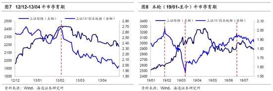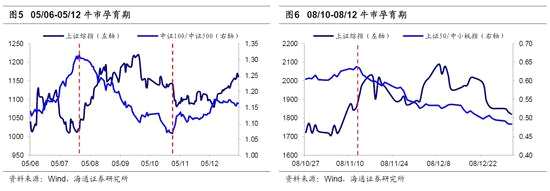 牛市孕育期市場(chǎng)特征:普漲輪漲。牛市第一階段行業(yè)普漲輪漲特征明顯,05/06-05/12牛市孕育期,價(jià)值搭臺(tái)成長(zhǎng)唱戲,用中證100/中證500比值作為價(jià)值/成長(zhǎng)風(fēng)向標(biāo),中證100/中證500從05/06/03低點(diǎn)1.13升至07/21的1.31,期間中證100上漲6.3%,中證500下跌7.3%,領(lǐng)漲行業(yè)銀行(期間漲幅12.5%)、傳媒(11.2%)、公用事業(yè)(7.6%)。隨后市場(chǎng)風(fēng)格偏向成長(zhǎng),中證100/中證500從07/21的1.31下降到10/24的1.07,期間中證100(1.8%),中證500(24.4%),領(lǐng)漲行業(yè)電力設(shè)備(38.3%)、國(guó)防軍工(37.3%)、建材(29.5%)、電子元器件(27.5%)。08/10-08/12牛市孕育期,同樣是價(jià)值搭臺(tái)成長(zhǎng)唱戲,用上證50/中小板指比值作為價(jià)值/成長(zhǎng)風(fēng)向標(biāo),上證50/中小板指從08/10/27的0.60升至11/12的0.64,期間上證50上漲11.6%,中小板指上漲5.8%,領(lǐng)漲行業(yè)建筑(14.3%),電力設(shè)備(12.4%)、建材(6.6%)。隨后市場(chǎng)風(fēng)格偏成長(zhǎng),上證50/中小板指從11/12的0.64大幅下降至12/31的0.48,期間上證50下跌5.0%,中小板指上漲25.5%,領(lǐng)漲行業(yè)電力設(shè)備(37.7%)、計(jì)算機(jī)(22.6%)、醫(yī)藥(21.4%)、商貿(mào)零售(19.6%)。12/12-13/04創(chuàng)業(yè)板牛市孕育期,市場(chǎng)風(fēng)格整體偏成長(zhǎng),但前期價(jià)值板塊也有表現(xiàn),用上證50/創(chuàng)業(yè)板指比值作為價(jià)值/成長(zhǎng)風(fēng)向標(biāo),前期價(jià)值成長(zhǎng)齊升,上證50/創(chuàng)業(yè)板指從12/12/03的2.58略微下降至13/02/08的2.48,期間上證50上漲33.3%,創(chuàng)業(yè)板指上漲38.6%,領(lǐng)漲行業(yè)國(guó)防軍工(60.0%)、非銀(48.7%)、銀行(43.1%)、計(jì)算機(jī)(34.9%)、傳媒(30.7%)。隨后價(jià)值退臺(tái),成長(zhǎng)獨(dú)舞,上證50/創(chuàng)業(yè)板指從02/08的2.48降至04/24的1.94,期間上證50下跌12.2%,創(chuàng)業(yè)板指上漲12.2%,領(lǐng)漲行業(yè)傳媒(11.7%)、電子元器件(10.3%)、通信(8.9%)。最新一輪(19/01-至今)牛市孕育期,市場(chǎng)風(fēng)格先價(jià)值后成長(zhǎng)再價(jià)值,用上證50/創(chuàng)業(yè)板指比值作為價(jià)值/成長(zhǎng)風(fēng)向標(biāo),上證50/創(chuàng)業(yè)板指從19/01/04的1.86上升至01/31的2.02,期間上證50上漲9.4%,創(chuàng)業(yè)板上漲1.1%,領(lǐng)漲行業(yè)家電(13.8%)、食品飲料(12.1%)、銀行(9.1%)。隨后市場(chǎng)風(fēng)格偏成長(zhǎng),上證50/創(chuàng)業(yè)板指從01/31的2.02下降至03/12的最低值1.53,期間上證50上漲9.5%,創(chuàng)業(yè)板指上漲44.4%,領(lǐng)漲行業(yè)計(jì)算機(jī)(55.1%)、農(nóng)林牧漁(54.5%)、電子元器件(45.6%)、通信(45.6%)。隨后市場(chǎng)風(fēng)格又回歸價(jià)值,上證50/創(chuàng)業(yè)板指從03/12的1.53升至06/20的1.96,期間上證50上漲8.2%,創(chuàng)業(yè)板指下跌15.5%,領(lǐng)漲行業(yè)食品飲料(24.5%)、旅游(11.2%)、家電(8.3%)。