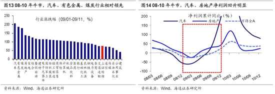 08/10-10/11牛市地產(chǎn)產(chǎn)業(yè)鏈依舊最強(qiáng)。金融危機(jī)爆發(fā)后,08年11月國(guó)家推出四萬(wàn)億經(jīng)濟(jì)刺激計(jì)劃,財(cái)政、貨幣政策轉(zhuǎn)向?qū)捤?,A股由此上演了一輪牛市行情。此輪牛市第二階段(09/01-09/11上證綜指最大漲幅87.4%)主導(dǎo)產(chǎn)業(yè)依舊是地產(chǎn)產(chǎn)業(yè)鏈,此外受益于2008年12月家電下鄉(xiāng)、09年1月汽車購(gòu)置稅下調(diào)以及3月汽車下鄉(xiāng)政策,牛市第二階段領(lǐng)漲行業(yè)包括下游的地產(chǎn)、汽車、家電,中游的建材,以及上游的有色金屬。汽車漲幅207%,有色187%,房地產(chǎn)138%,家電134%,建材116%,上證綜指75%。從業(yè)績(jī)上看,各行業(yè)業(yè)績(jī)回升陡峭,汽車行業(yè)歸母凈利潤(rùn)累計(jì)同比增速?gòu)?8Q4的-54%(ROE-TTM 5.5%)升至09Q4的197%(15.2%),房地產(chǎn)從1%(9.7%)升至44%(13.2%),家電從-30%(6.9%)升至149%(15.8%),建材從-10%(7.8%)升至53%(10.6%),有色從-88%(4.7%)收窄至-12%(4.0%)。估值方面,08Q4至09Q4期間,汽車PE(TTM)從14到59倍,房地產(chǎn)18到45倍,家電18到47倍,建材24到50倍。從基金持倉(cāng)市值占比看牛市第二階段主導(dǎo)行業(yè)受青睞程度上升,汽車行業(yè)占比從08Q4的0.40%升至09Q4的3.72%,家電從2.27%升至3.9%,建材從1.11%升至1.37%,有色從0.86%升至1.53%。房地產(chǎn)從08Q4的8.04%升至09Q2高點(diǎn)15.06%。