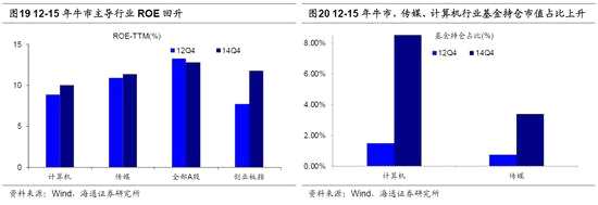 12/12-15/06牛市移動(dòng)互聯(lián)網(wǎng)產(chǎn)業(yè)為主導(dǎo)。2010年前后美國(guó)帶領(lǐng)全球重構(gòu)經(jīng)濟(jì)增長(zhǎng)模式,進(jìn)入移動(dòng)互聯(lián)帶領(lǐng)的創(chuàng)新周期,中國(guó)隨后進(jìn)入3G時(shí)代,3G滲透率快速提高,移動(dòng)網(wǎng)民數(shù)量大幅增加,以移動(dòng)互聯(lián)為代表的新技術(shù)在中國(guó)迅速生根發(fā)芽,由此推動(dòng)科技股業(yè)績(jī)迅速提升。此輪牛市第二階段(13/04-14/12創(chuàng)業(yè)板指最大漲幅92.3%)主導(dǎo)板塊是以創(chuàng)業(yè)板為代表的科技股,主導(dǎo)產(chǎn)業(yè)鏈?zhǔn)怯?jì)算機(jī)、傳媒等TMT行業(yè)。13/04-14/12創(chuàng)業(yè)板指漲幅75%、計(jì)算機(jī)154%、傳媒129%、移動(dòng)支付指數(shù)165%,云計(jì)算指數(shù)113%。從業(yè)績(jī)上看,創(chuàng)業(yè)板指凈利潤(rùn)累計(jì)同比增速?gòu)?2Q4的-9%(ROE-TTM7.7%)回升至14Q4的26%(11.8%),計(jì)算機(jī)從-8%(8.9%)升至24%(10.0%),傳媒16%(10.9%)升至19%(11.4%),移動(dòng)支付指數(shù)從-33%(7.7%)升至18%(10.0%),云計(jì)算指數(shù)-73%(1.8%)升至40%(11%)。估值方面,12Q4至14Q4期間,創(chuàng)業(yè)板PE(TTM)從36到60倍,計(jì)算機(jī)30到72倍,傳媒27到49倍,移動(dòng)支付指數(shù)從28倍升至56倍,云計(jì)算指數(shù)從42倍到44倍。從基金持倉(cāng)市值占比上看,12Q4至14Q4期間,計(jì)算機(jī)行業(yè)基金持倉(cāng)市值占比從12Q4的1.50%升至14Q4的8.87%,傳媒行業(yè)從0.75%升至3.39%。